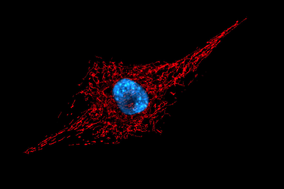 Fluorescence microscopy: Mitochondrial reticular network (stained in red with a live marker) and the nucleus (stained in blue through DNA intercalation)