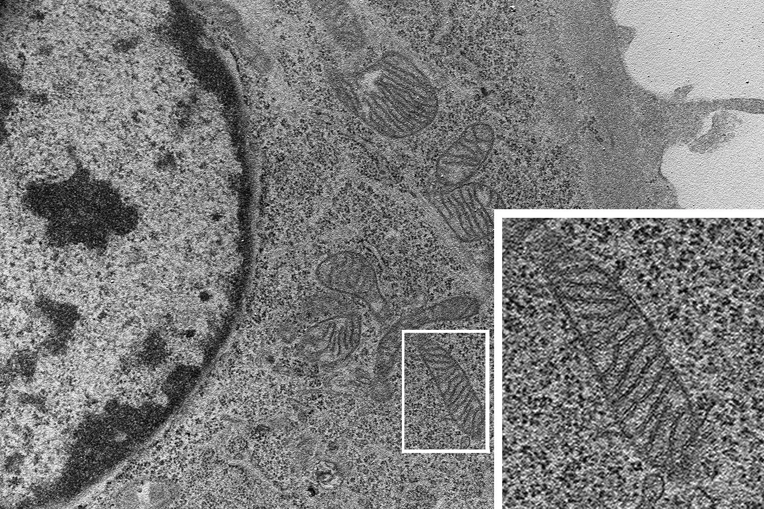 Transmission electron microscopic (TEM) image depiciting a healthy mitochondria with abundant inner membrane invaginations (cristae) and nucleus on the left.