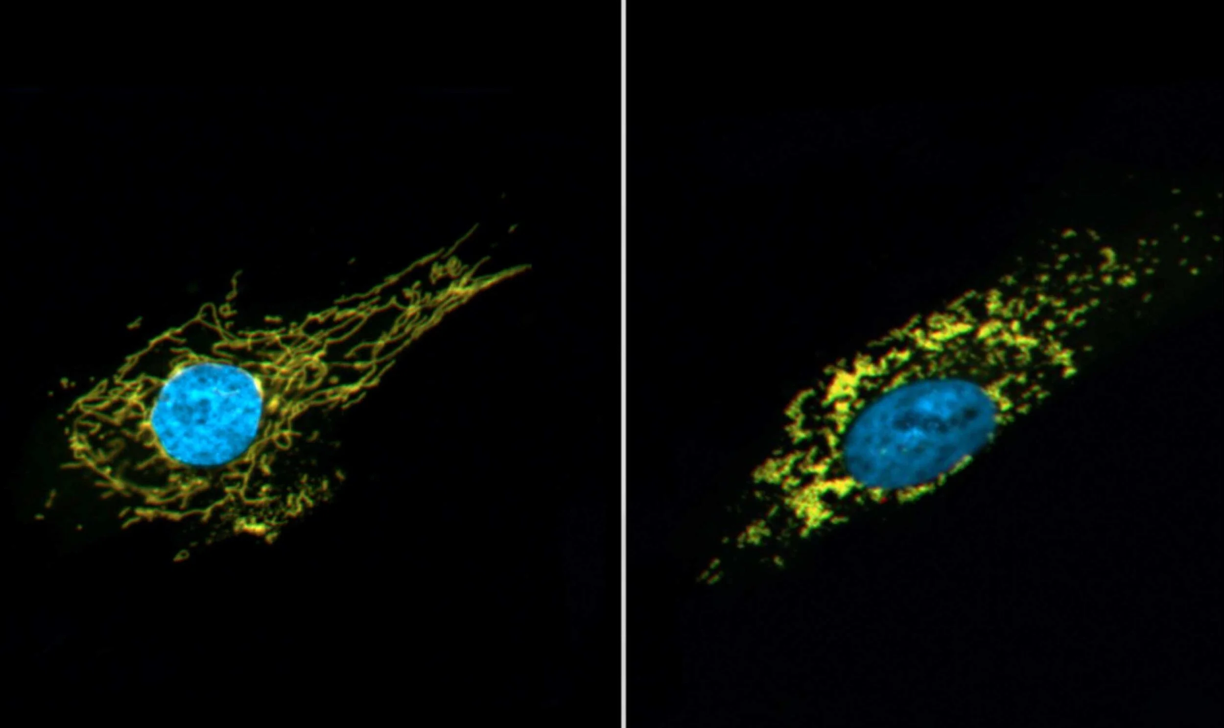 Fluorescence microscopy: Mitochondrial reticular network appearance in healthy cells visualised by a stably-expressed mitochondrial fluorescent marker in healthy (left) and stress-induced (right) states.