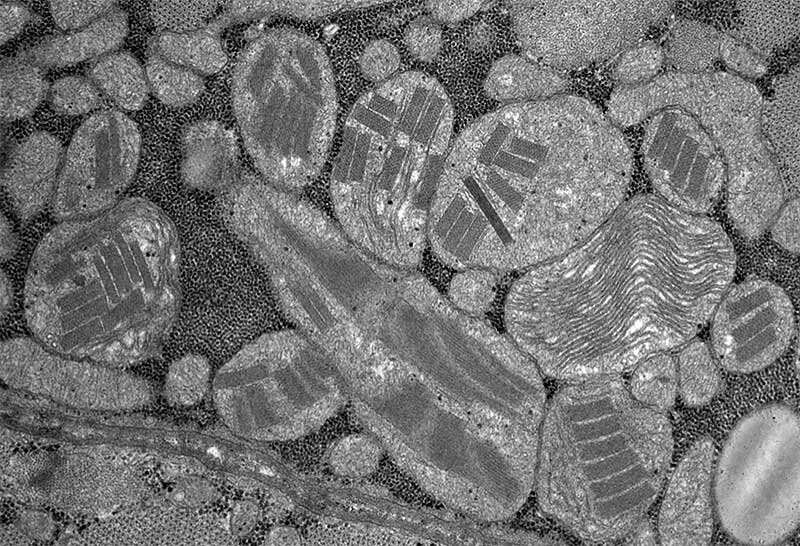 Transmission electron microscopic (TEM) image of human skeletal muscle (cross section) in a patient harbouring a mitochondrial tRNA mutation. The image shows aberrantly enlarged mitochondria with disturbed cristae and crystalline inclusions (“parking lot inclusions"). Image width approximately 10 uM.